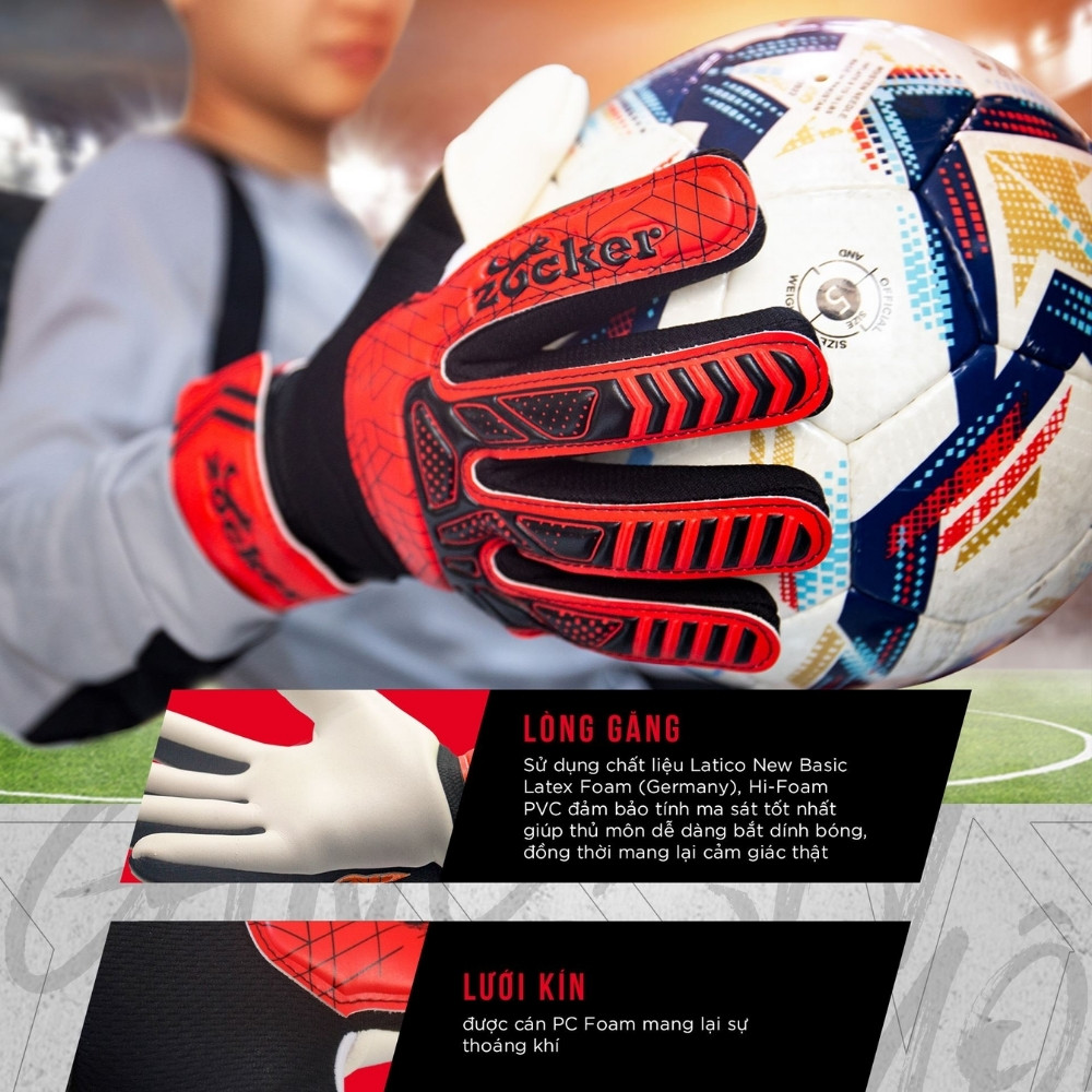 Găng tay thủ môn Zocker Dino là mẫu găng cơ bản, hàng chính hãng, phù hợp với luyện tập và thi đấu bóng đá trên các sân cỏ nhân tạo, bán chuyên nghiệp.
