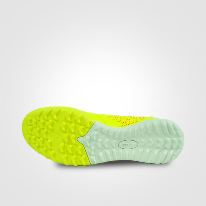 - Mặt đế cao su được thiết kế là loại đinh dăm TF quen thuộc cho sân cỏ nhân tạo với hệ thống đinh được phân bổ đều khắp chống trơn trượt rất hiệu quả, đồng thời giúp người chơi di chuyển linh hoạt và có những cú sút bóng chính xác hơn