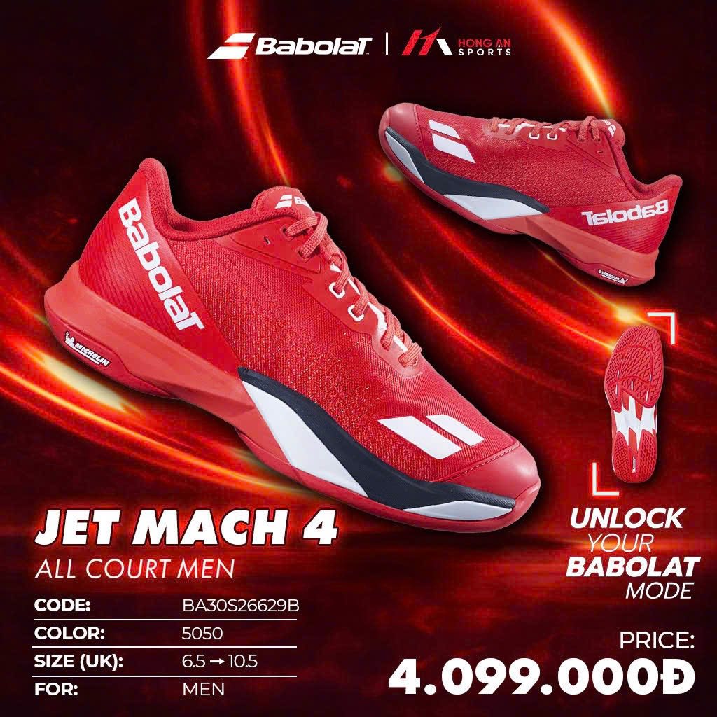Giày Pickleball Babolat Jet Mach 4 All Court là mẫu giày hiệu suất cao được thiết kế dành cho người chơi yêu thích tốc độ, sự linh hoạt và khả năng phản xạ nhanh trên sân. Phiên bản màu Đỏ mã 30S26629B-5050 nổi bật với thiết kế thể thao mạnh mẽ, kết hợp cấu trúc công nghệ hiện đại giúp tối ưu chuyển động đa hướng trong Pickleball và Tennis.