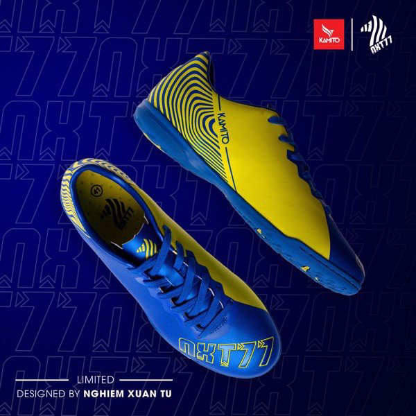 Giày bóng đá sân cỏ nhân tạo KAMITO NXT77 xanh vàng là mẫu giày được chính cầu thủ Nghiêm Xuân Tú lên ý tưởng và chắp bút.
