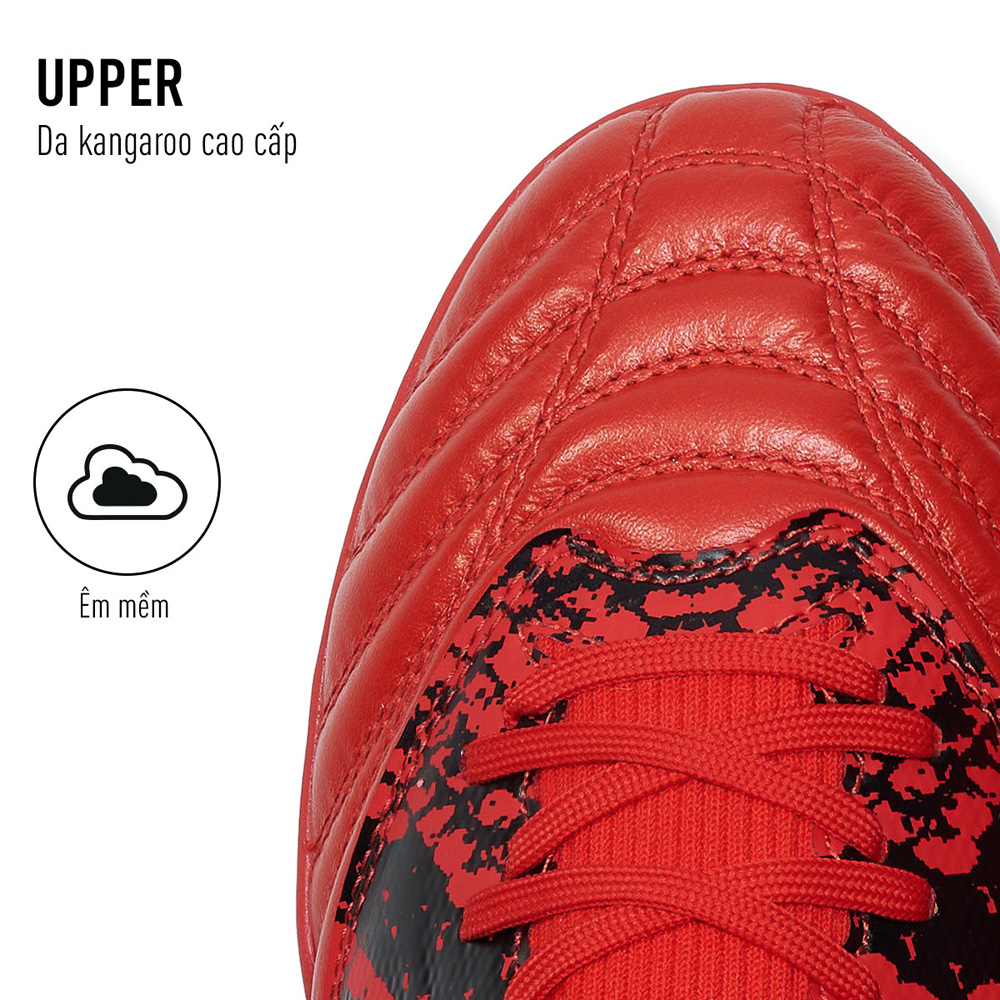 - Upper: Da kangaroo cao cấp mềm mại, ôm sát, kết hợp lưỡi gà liền dệt kim 3D từ chất liệu vải Mesh, mang lại cảm giác êm ái, tăng cường khả năng kiểm soát bóng.