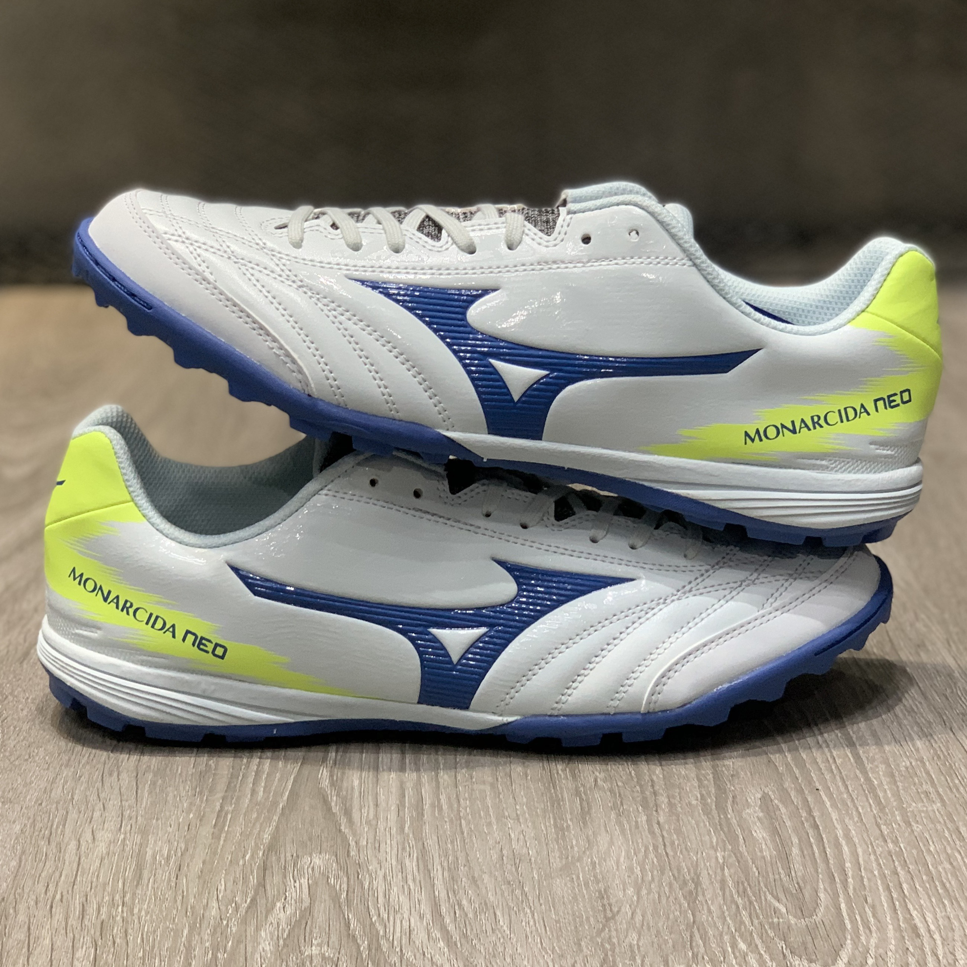 Giày bóng đá Mizuno Monarcida Neo Sala Pro TF Trắng/Xanh/Vàng