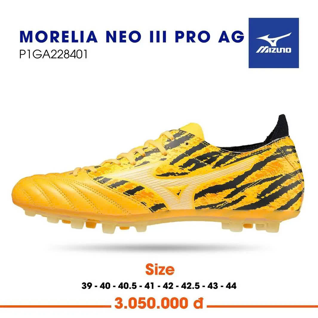 Mizuno Morelia Neo 3 Pro AG - Vàng Vằn - P1GA228401 là mẫu giày đá bóng sân cỏ nhân tạo dành cho sân 7-11 người. Ngoài ra Morelia AG còn có thể linh hoạt sử dụng trên mặt sân cỏ tự nhiên.