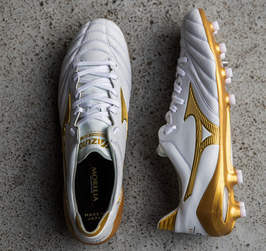 Giày bóng đá Mizuno Morelia Neo KL II As trắng vàng là sản phẩm nổi bật trong bộ sưu tập "Victory Gold" của Mizuno, được phát hành đầu năm 2020. Được lấy cảm hứng từ hoàng gia, vinh danh sắc gold tráng lệ và sang trọng của kim loại vàng, đem đến cho người mang cảm giác vương giả.