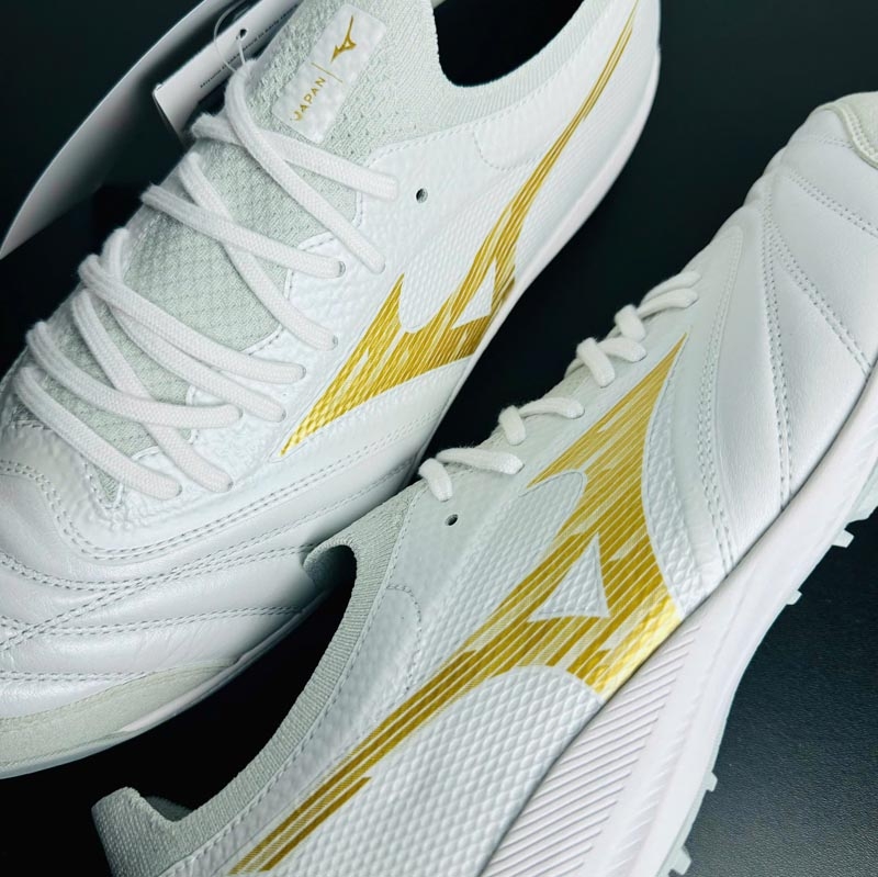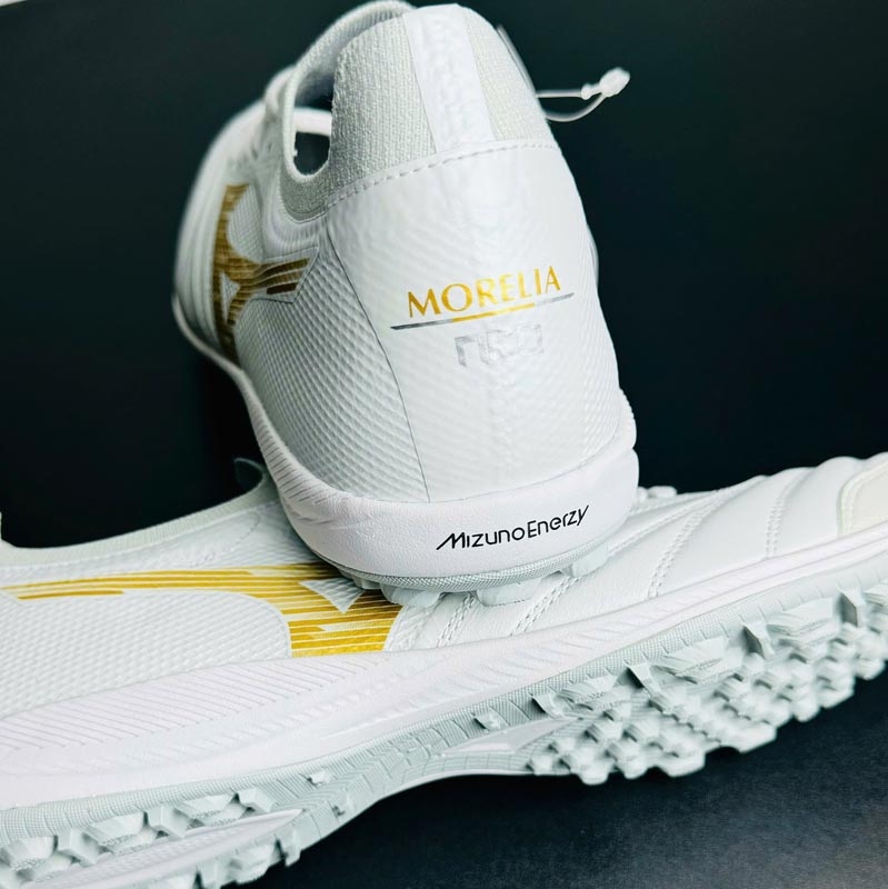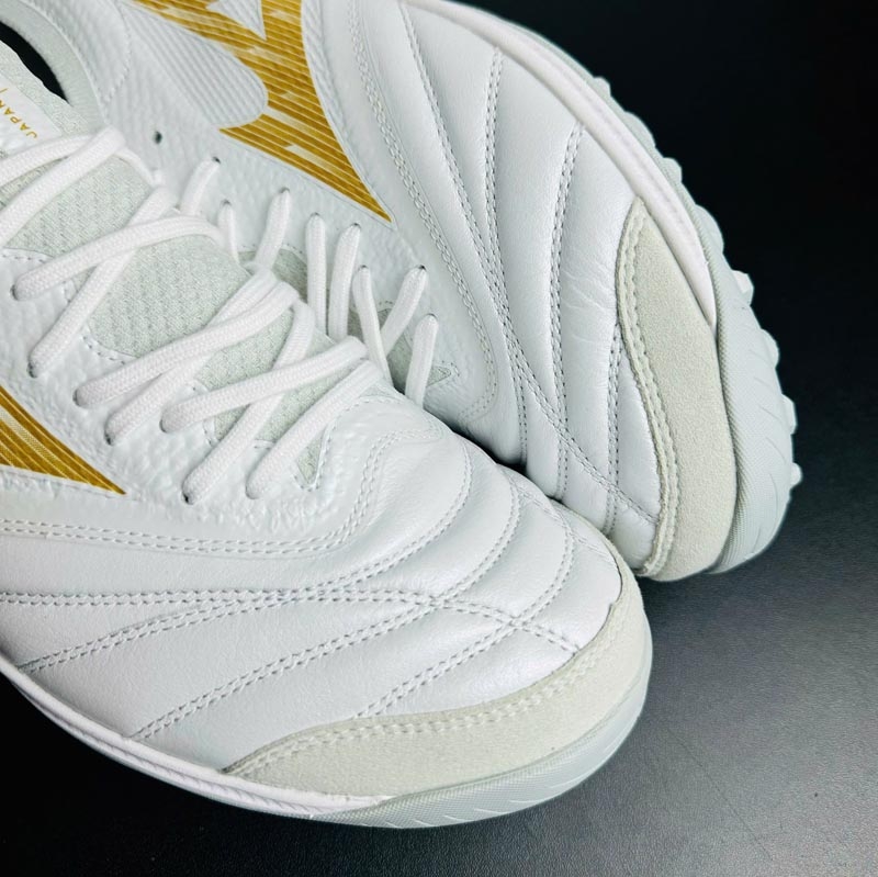 Phối màu Trắng/Vàng Gold mang phong cách hiện đại và cao cấp, giúp người chơi nổi bật trên sân. Logo Mizuno RunBird được đặt nổi bật hai bên thân giày, tạo điểm nhấn thương hiệu rõ ràng và mạnh mẽ.