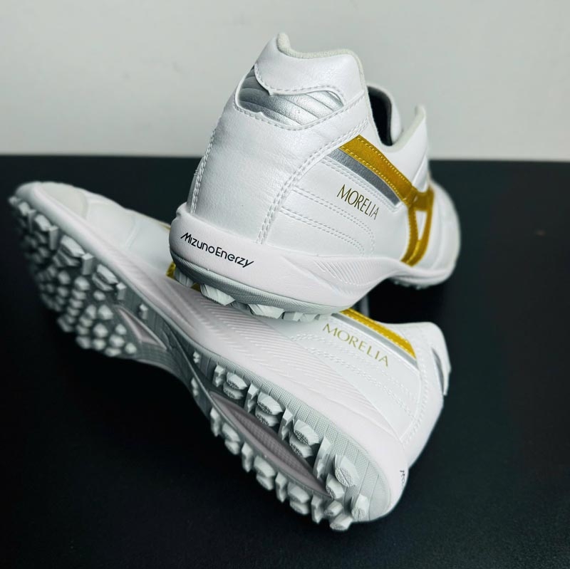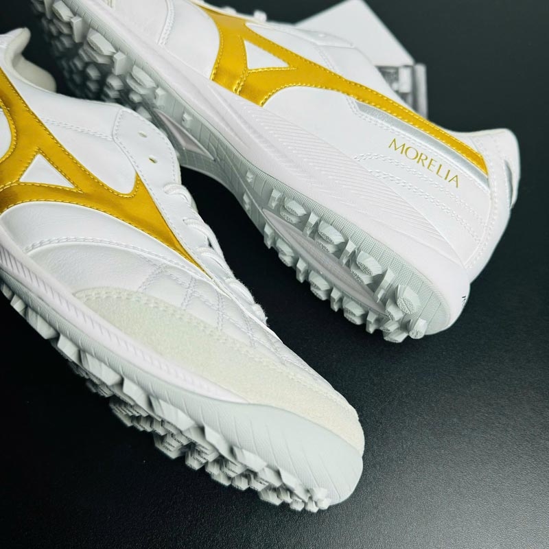 Thiết kế tổng thể của đôi giày mang phong cách cổ điển đặc trưng của dòng Morelia, kết hợp gam màu Trắng chủ đạo cùng điểm nhấn Vàng Gold tạo nên vẻ ngoài tinh tế nhưng vẫn nổi bật trên sân. Form giày ôm chân tự nhiên, mang lại cảm giác vừa vặn và chắc chắn ngay từ khi xỏ giày.