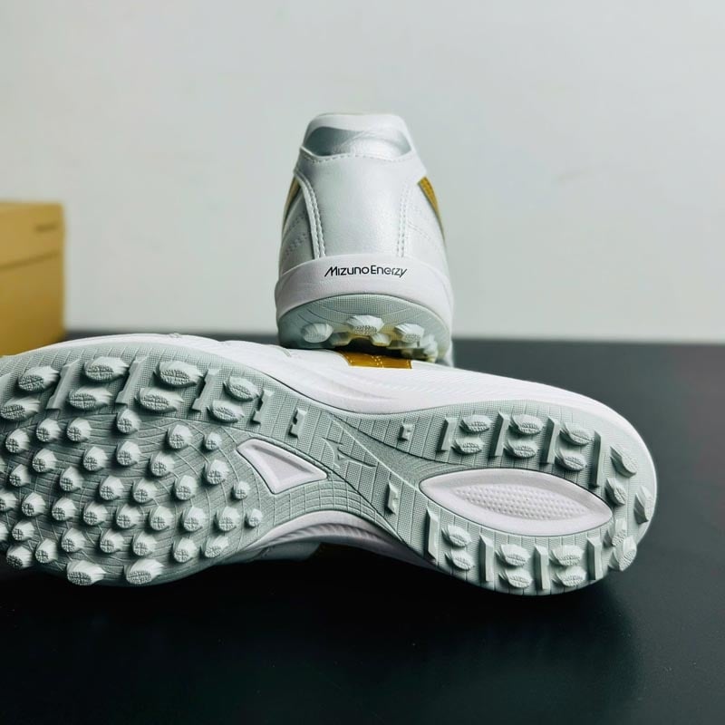 Mizuno Morelia Sala Pro TF - Màu Trắng/Vàng Gold - Q1GB261350 là mẫu giày đá bóng sân cỏ nhân tạo thuộc dòng Morelia cao cấp của Mizuno, hướng tới người chơi phong trào nâng cao và bán chuyên. Thiết kế mang phong cách cổ điển đặc trưng của Morelia, kết hợp phối màu White/Gold tinh tế, tạo cảm giác sang trọng nhưng vẫn đậm chất thi đấu.