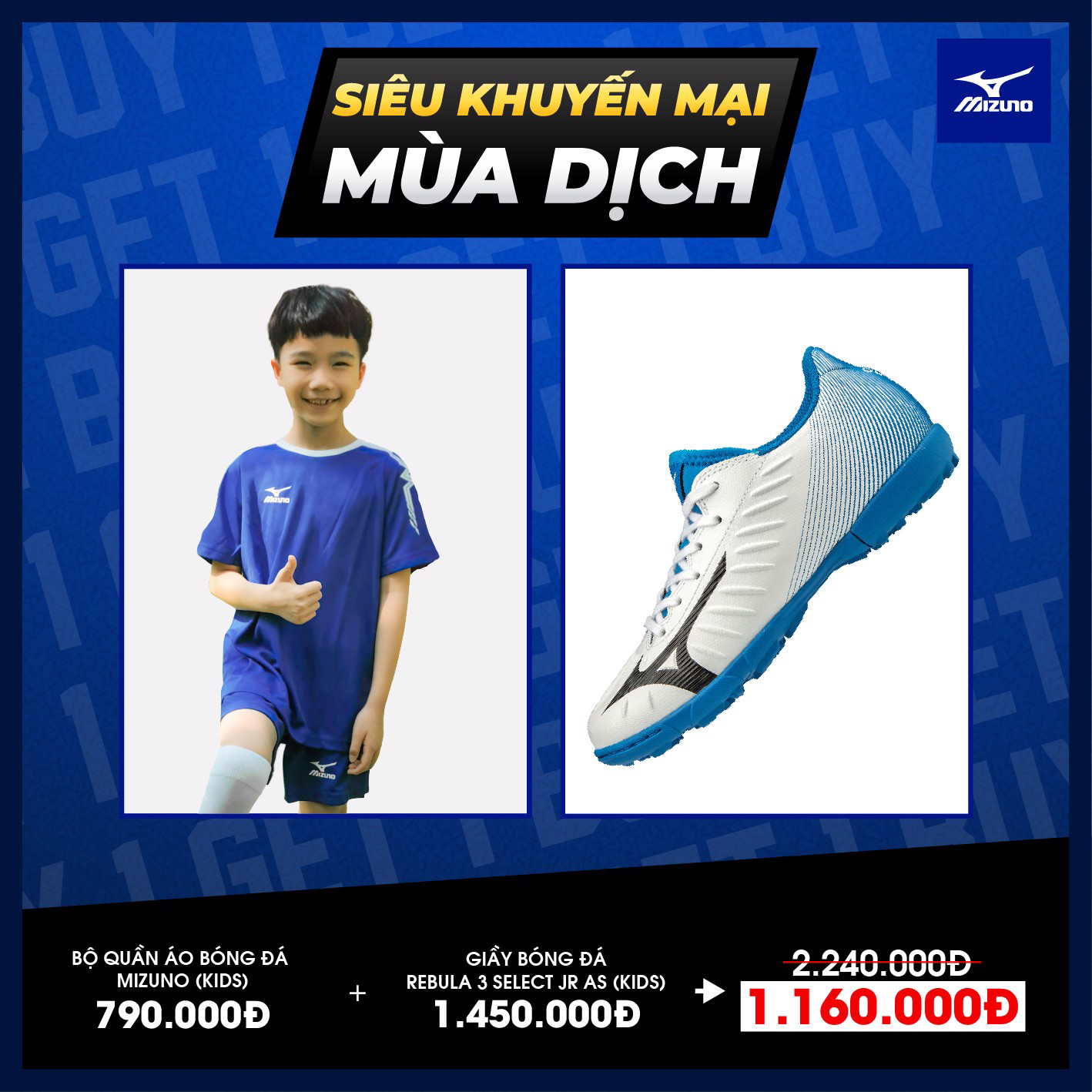 ⚡ ƯU ĐÃI MÙA DỊCH DÀNH RIÊNG CHO CÁC CẦU THỦ NHÍ> Trở lại đam mê sau mùa dịch, Mizuno có những ưu đãi vô cùng hấp dẫn dành riêng cho các bạn nhỏ không thể bỏ qua:* Giày bóng đá trẻ em Rebula 3 Select JR AS giảm ngay 20%, chỉ còn 1,160,000 VNĐ* Chưa dừng lại ở đó, khi mua 01 đôi giày Rebula 3 Select JR AS (với giá đã giảm 1,160,000 VNĐ) được tặng ngay 01 bộ quần áo bóng đá trẻ em Mizuno trị giá 790,000 VNĐ.> Chương trình áp dụng từ hôm nay cho tới khi có thông báo mới.