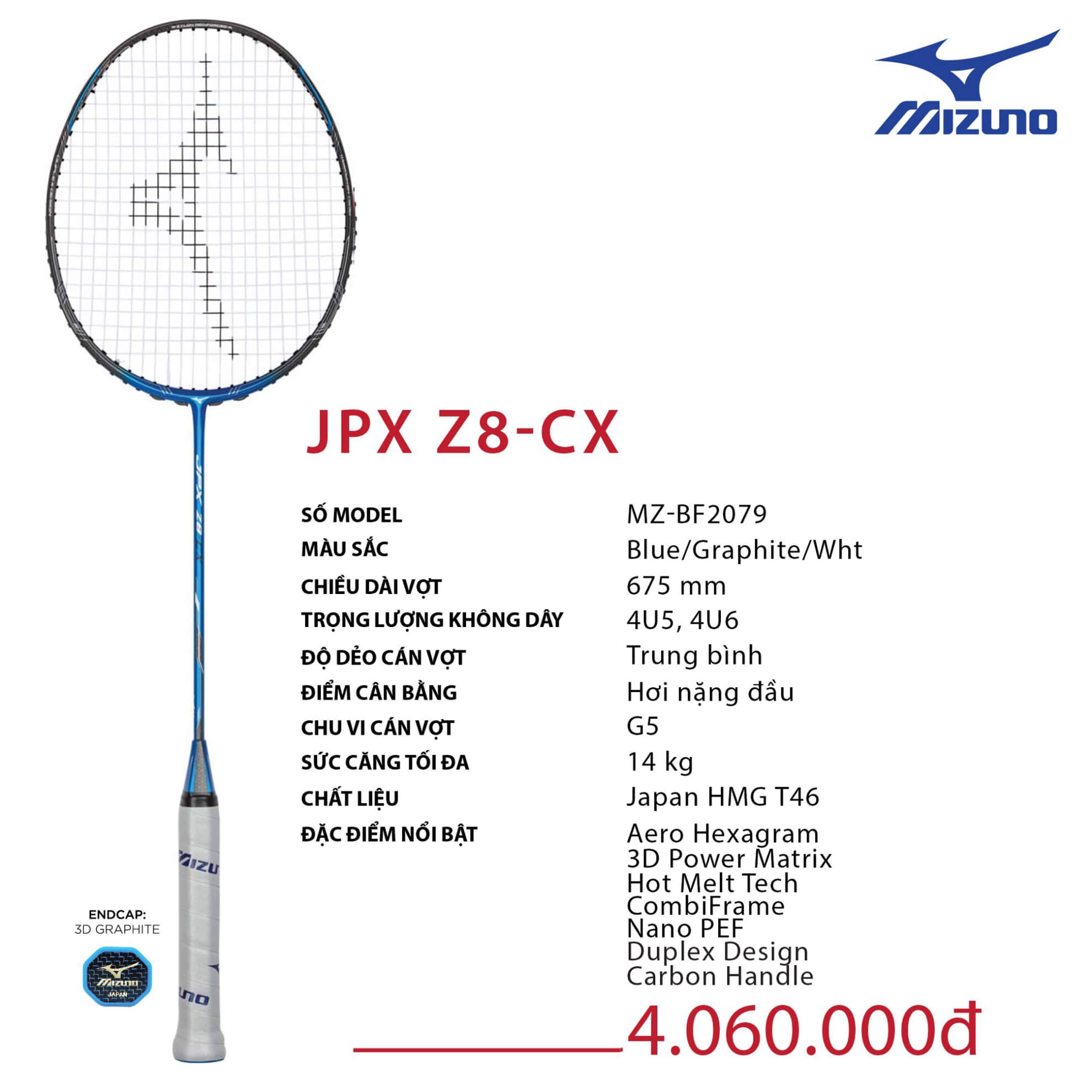 JPX Z8-CX là dòng vợt rất đặc biệt khi có tay cầm bằng carbon hoàn toàn mới, giúp cây vợt có tính thống nhất cao và ổn định hơn. Vợt hơi nặng đầu nên đập cầu rất tốt nhưng trọng lượng chỉ là 4U nên vẫn giữ được sự linh hoạt. Thân vợt cứng trung bình không quá khó khăn để người chơi có thể sử dụng ngay.