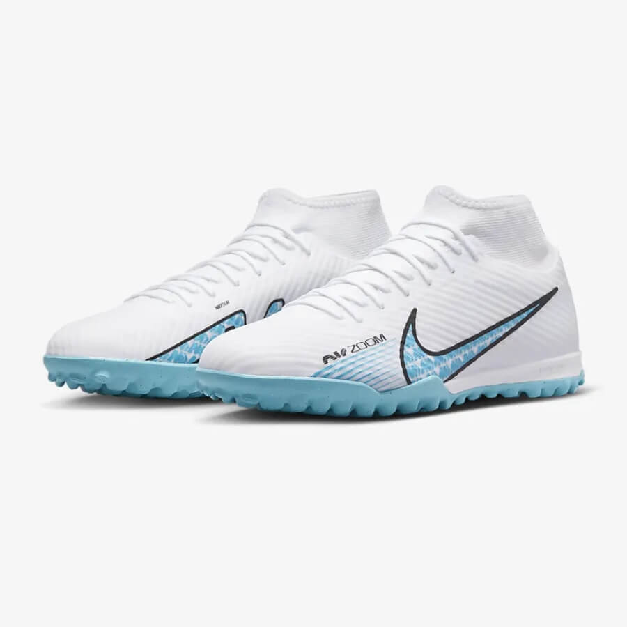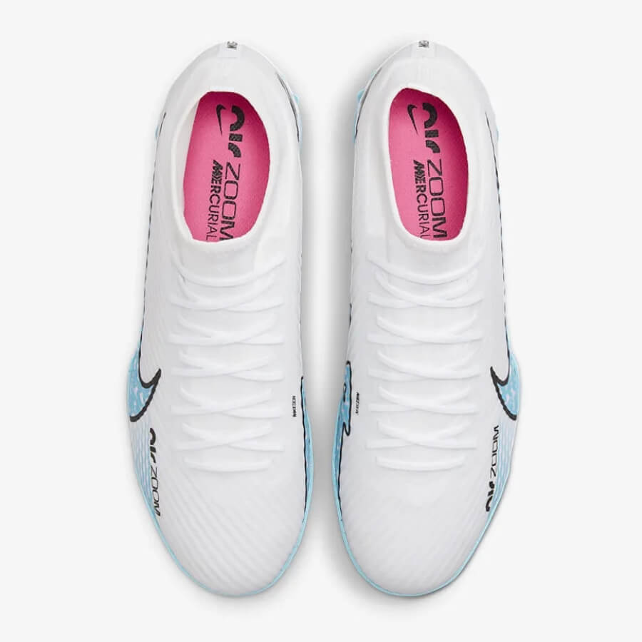 Thế hệ tiếp theo của dòng giày tốc độ Mercurial chính thức được ra mắt và hứa hẹn sẽ lại bùng nổ doanh số. Cải tiến lớn nhất trên thế hệ mới này của Nike là được trạng bị thêm bộ đệm Zoom Air được thiết kế độc quyền. Giày đá bóng Nike Air Zoom Mercurial Superfly 9 Academy TF - Trắng/Xanh - DJ5629-146 là mẫu giày chuyên dùng cho sân cỏ 5-7 người.